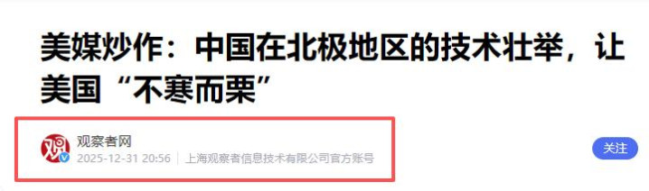 观察者网2025-12-31《美媒炒作:中国在北极地区的技术壮举,让美国“不寒而栗”》